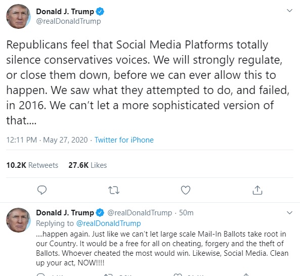 “Republicans feel that Social Media Platforms totally silence conservatives voices. We will strongly regulate, or close them down, before we can ever allow this to happen.”
