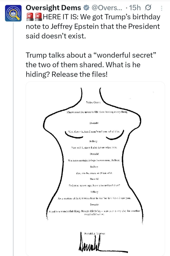 “HERE IT IS: We got Trump’s birthday note to Jeffrey Epstein that the President said doesn’t exist,” wrote House Democrats in the X post on Monday afternoon, September 8.