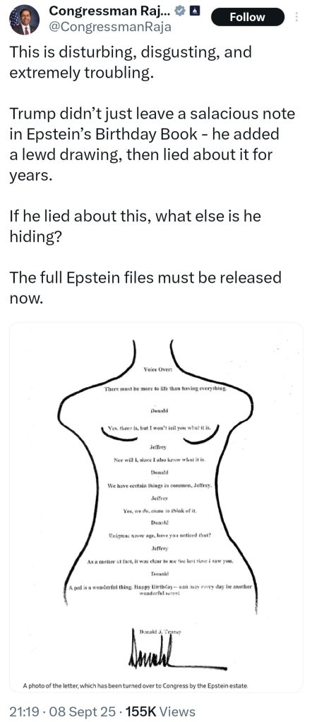 Democratic Rep Robert Garcia, who is a ranking member on the Committee on Oversight and Government Reform, wrote on X: “We got the Epstein note Trump says doesn’t exist. Time to end this White House cover-up.”