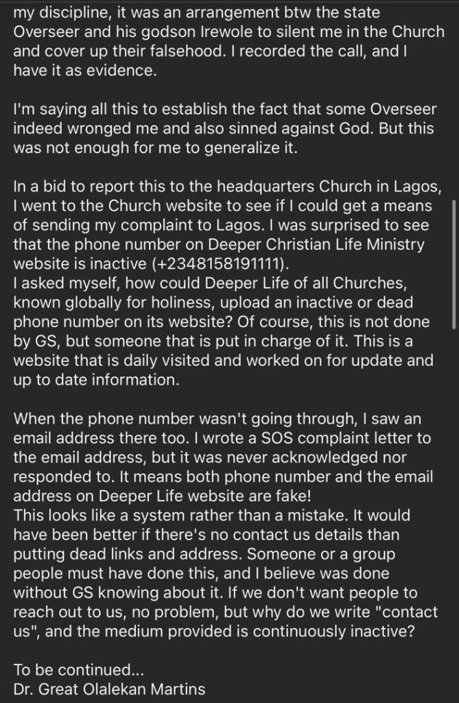 Great added that his attempts to report the matter to Pastor Kumuyi failed due to poor communication channels within the church.