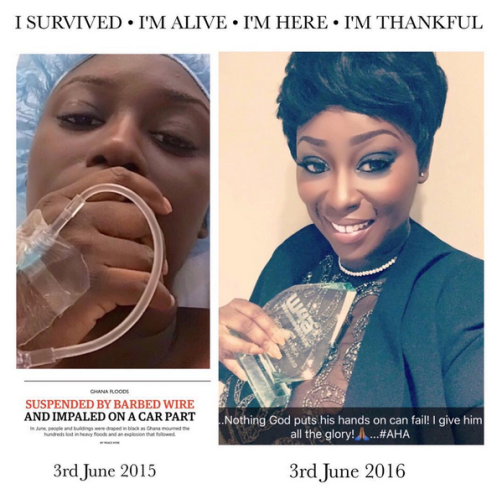 “I woke up on the morning of the 3RD JUNE 2015 not realizing that I would be hospitalized BARELY holding on to my LIFE by the end of that day. I drowned and incurred horrific injuries in the Accra floods only 12 months ago. Doctors didn’t know if I would walk again, this was the day the REST of my life CHANGED. From this day last year, EVERYDAY has been a STRUGGLE physically, mentally and emotionally. But as I look at this image I regain my STRENGTH. #FaithbuilderFamily unlike so many souls we lost this time last year – I SURVIVED!!!. I forgot the long list of wishes I ask God for daily and simply asked him to just simply to “LET ME LIVE!”. My injuries from the flood caused me to be hospitalized for over a month with 13 metal staples in my back and 2 metal plates, I could not WALK without assistance. I remember the lives I saw disappear around me and I am forever THANKFUL to God. As long as you have BREATH