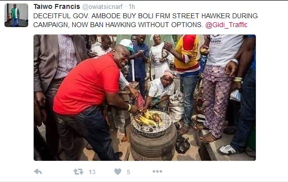Twitter user blast Gov Ambode for trying to stop street hawking
