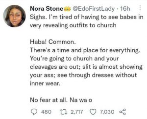 “A lady took toTwitter to lament about women wearing revealing outfits to church.