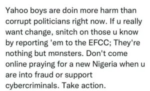 “Yahoo boys are doing more harm than corrupt politicians right now. If u really want change, snitch on those u know by reporting ’em to the EFCC; They’re nothing but monsters. Don’t come online praying for a new Nigeria when u are into fraud or support cyber criminals. Take action.”