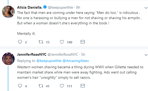 Some asked her to shave because it was unsightly. But some others came to her defense and said no one ever forces men to shave yet they feel comfortable telling women what to do with their bodies.