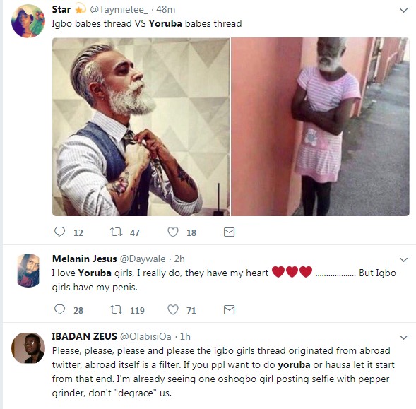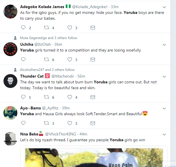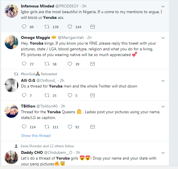 Today some Igbo and Yoruba ladies have engaged in a war of words on Twitter for the last 3 hours, and things are seemingly pretty tense.