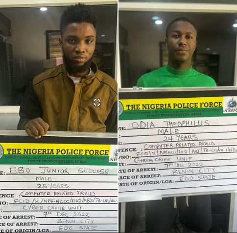 Two men, Ebo Junior Success and Odia Theophilus have been arrested by the Nigeria Police Force National Cybercrime Centre (NPF-NCCC) for crimes relating to computer-related fraud, identity theft, cryptocurrency fraud, and obtaining money by false pretence.