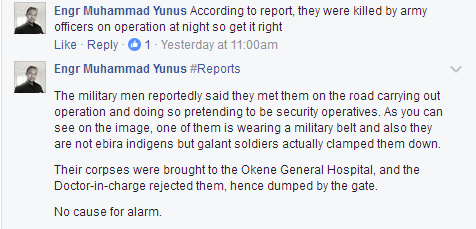 “They said they met them on the road carrying out operation and doing so pretending to be security operatives. As you can see on the image, one of them is wearing a military belt and also they are not ebira indigens but galant soldiers actually clamped them down. Their corpses were brought to the Okene General Hospital, and the Doctor-in-charge rejected them, hence dumped by the gate.”