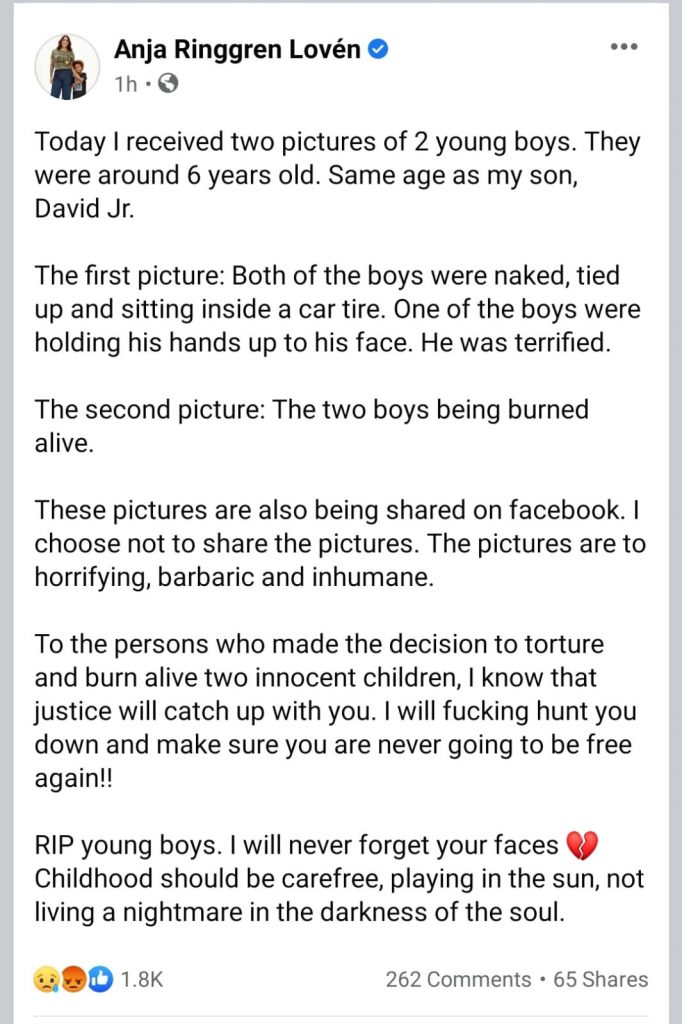 Anja Ringgren Loven, a philanthropist who has rescued numerous children branded witches and abandoned in Akwa Ibom State and Femi Fani-Kayode joined to express outrage after photos of the boys stripped naked with a tyre placed on them went viral. Another photo shows fire blazing, allegedly burning the boys’ bodies