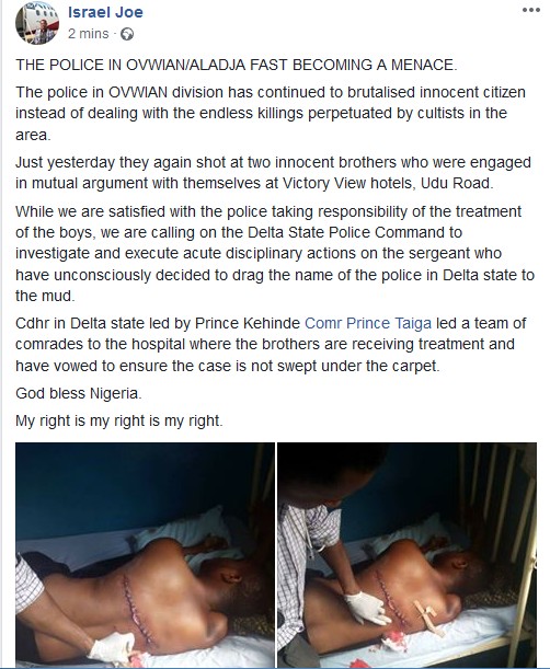 Two brothers have landed in a hospital after being allegedly brutalized by a policeman in Ovwian town, Delta State. According to reports, the brothers were injured by the officer while arguing between themselves at Victory View hotel along Udu road in the area. Israel Joe who shared the story, reveled that the police took responsibility for their action and took the victims to the hospital for treatment.