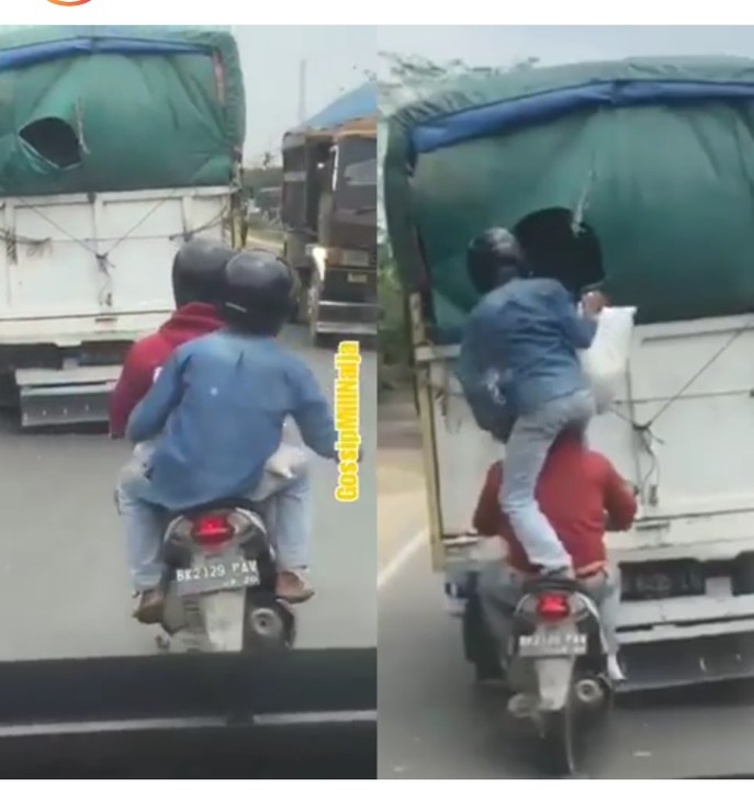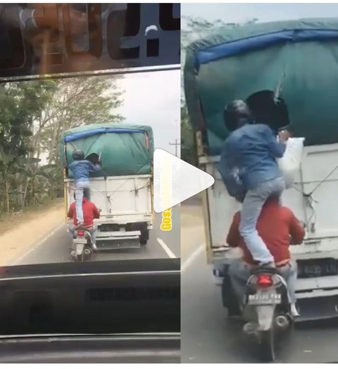 Two men who Have PHD in robbery, Caught red handed stealing from a moving truck while smoothly riding on an Okada Bike on the express road.