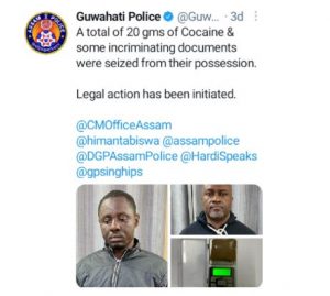 “@GuwahatiPol hits an international drug supply chain! In an operation led by JCP Partha Mahanta, 20 gram Cocaine has been seized. Also, two accused from Nigeria have been apprehended. Well done. Keep it up @assampolice”
