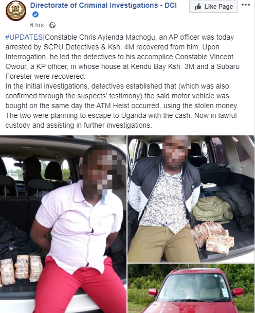 Constable Chris Ayienda Machogu, an AP officer was today arrested by SCPU Detectives & Ksh. 4M recovered from him. Upon Interrogation, he led the detectives to his accomplice Constable Vincent Owour, a KP officer, in whose house at Kendu Bay Ksh. 3M and a Subaru Forester were recovered.
