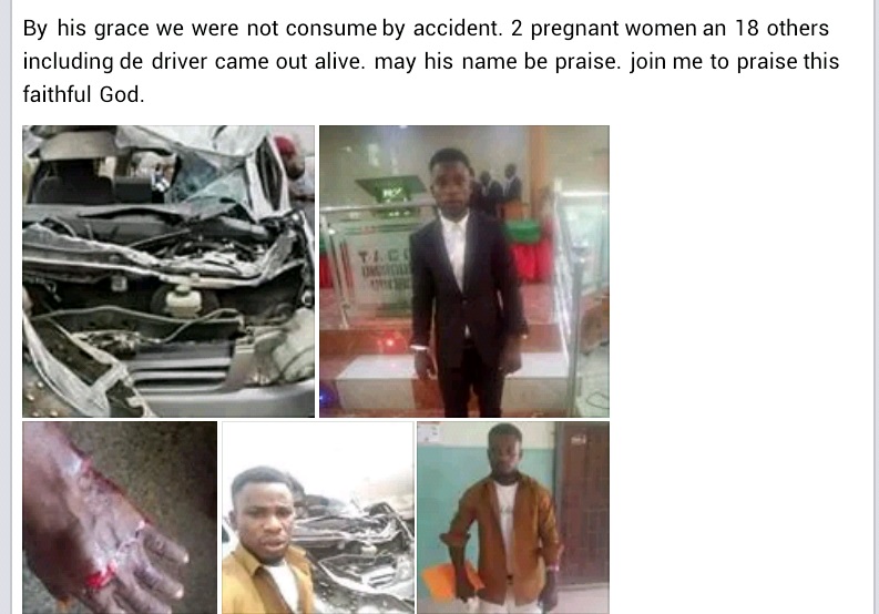 The victims sustained various degrees of injuries but no life was lost. One of the injured passengers, Mfon Effiong, who is based in Warri, shared photos from the scene thanking God for saving their lives