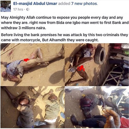 Two suspected robbers beaten mercilessly in Bida, Niger State, after a failed attempt to snatch N3 million from a man who was leaving the premises of a First Bank Plc branch.