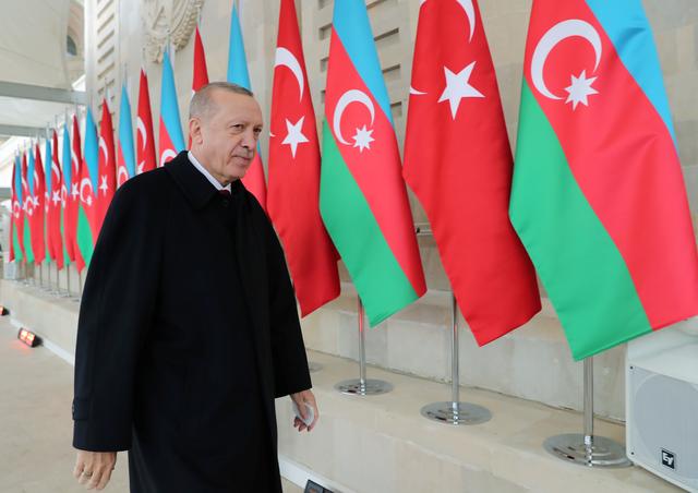 Turkish President Tayyip Erdogan arrives at a military parade to mark the victory on Nagorno-Karabakh conflict, in Baku, Azerbaijan December 10, 2020. Murat Cetinmuhurdar/Presidential Press Office/Handout via REUTERS