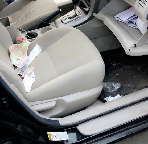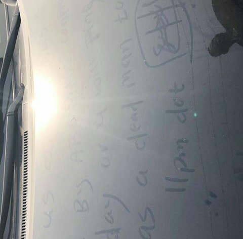 So this morning In Lekki phase 1, i was sleeping when the security man came to wake me up that he caught someone broke into my car with the things he stole from the car and everywhere ransacked, we called the security agency and they called the cops but they had no patrol vehicle as they said, we decided to take him to the Lekki Divisional Police station, the case was reported, i wrote a statement as the complainant, to cut the story short they asked if i wanted to charge the thief to court and that I’ll have to pay for the transport and some stuffs to be able to charge a thief to court, i told them i don’t want to be the one responsible for sending another man to prison for stealing things i already recovered, they still begged for money anyway cos they found out i just came back from America, i gave them some money and i wrote a letter to withdraw the case and let everything go, so before i could come back outside one of the policemen went and wrote on my car “MEET US AT THE ELF BUS STOP SAYS BY AROMATE CONFRATERNITY TODAY OR YOU WILL FINE YOURSELF AS A DEAD MAN BY 11 ON THE DOT signed “