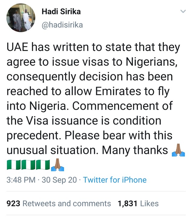 UAE has written to state that they agree to issue visas to Nigerians, consequently decision has been reached to allow Emirates to fly into Nigeria.