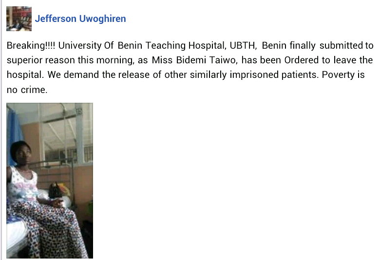 “Breaking!!!! University Of Benin Teaching Hospital, UBTH, Benin finally submitted to superior reason this morning, as Miss Bidemi Taiwo, has been Ordered to leave the hospital. We demand the release of other similarly imprisoned patients. Poverty is not a crime”