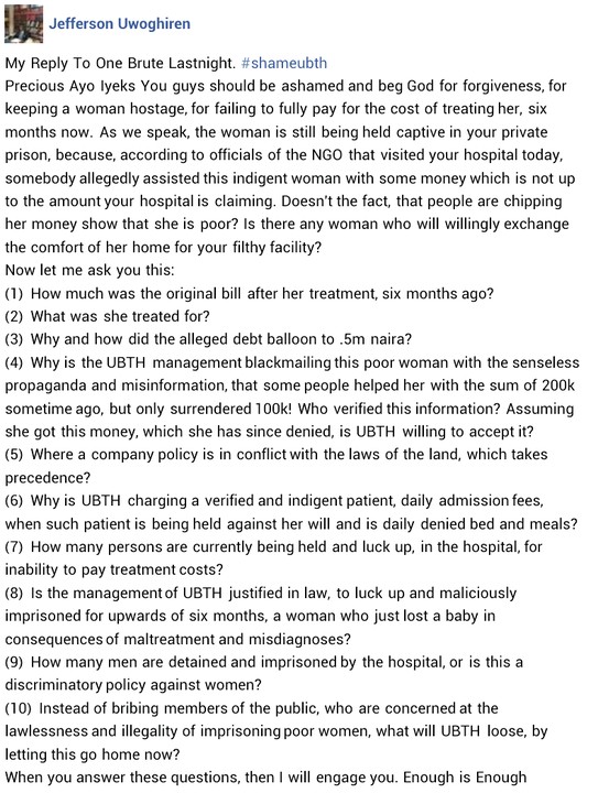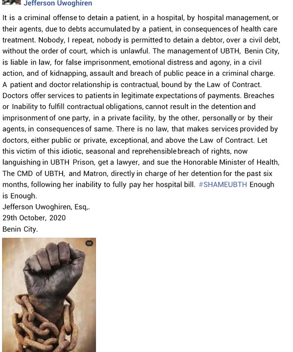 “It is a criminal offense to detain a patient, in a hospital, by hospital management, or their agents, due to debts accumulated by a patient, in consequences of health care treatment. Nobody, I repeat, nobody is permitted to detain a debtor, over a civil debt, without the order of court, which is unlawful. The management of UBTH, Benin City, is liable in law, for false imprisonment, emotional distress and agony, in a civil action, and of kidnapping, assault and breach of public peace in a criminal charge. A patient and doctor relationship is contractual, bound by the Law of Contract. Doctors offer services to patients in legitimate expectations of payments. Breaches or Inability to fulfill contractual obligations, cannot result in the detention and imprisonment of one party, in a private facility, by the other, personally or by their agents, in consequences of same. There is no law, that makes services provided by doctors, either public or private, exceptional, and above the Law of Contract. Let this victim of this idiotic, seasonal and reprehensible breach of rights, now languishing in UBTH Prison, get a lawyer, and sue the Honorable Minister of Health, The CMD of UBTH, and Matron, directly in charge of her detention for the past six months, following her inability to fully pay her hospital bill. #SHAMEUBTH Enough is Enough.”