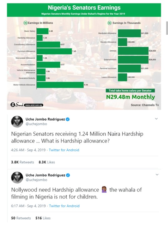 Uche Jombo in a new tweet questioned the payment of N1.2m to Nigerian senators as hardship allowance.