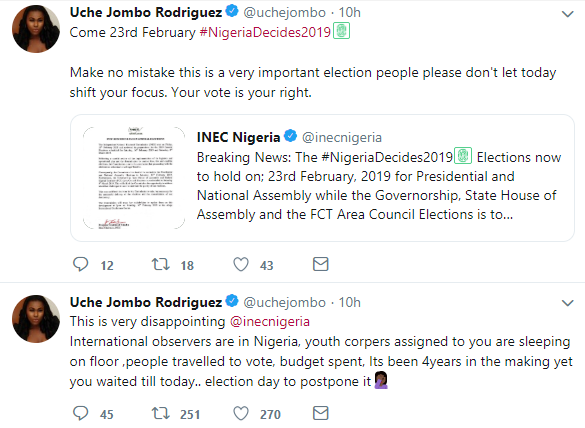 Uche Jombo who wondered why INEC waited till the eve of election day to announce the postponement, stated that International observers and corps members have already invested so much in the elections. She wrote;