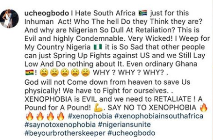 Uche Ogbodo however got lampooned by Nigerians and South Africans, forcing her to delete the post and turn off her comment section on Instagram.