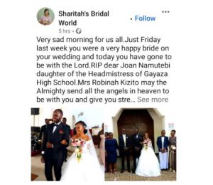 Namutebi wedded Mr Derrick Wabwire last Friday and went for a birth control procedure on Saturday before she slipped into a coma and died.