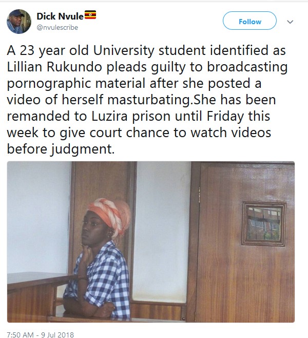 How Ironic! A young lady has landed in trouble after sharing a video of herself masturbating. The 23-year-old student of Uganda Christian University identified as Lillian Rukundo pleaded guilty to broadcasting pornographic material after she posted a video of herself self masturbating.