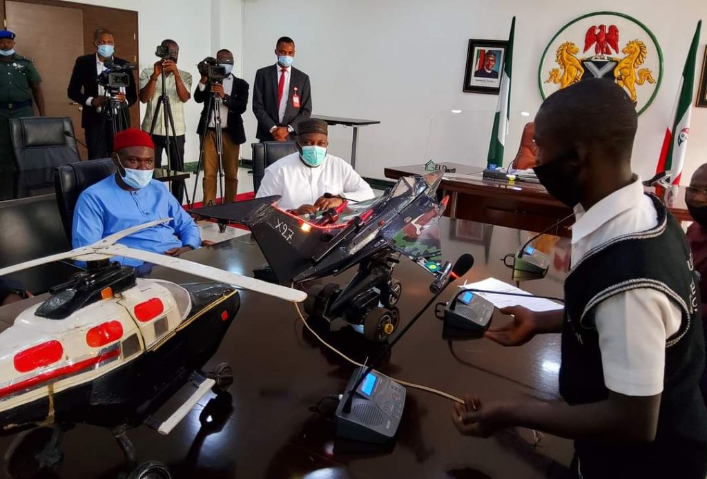 Governor Ifeanyi #Ugwuanyi of #Enugu State has offered scholarships, up to University level, to the Enugu and Anambra-born young students of Government Technical College (GTC), Nsukka and Enugu, Master Emmanuel Maduabuchi Chukwu and Master Chukwuebuka Udoye, who locally manufactured two aircraft (helicopter and jet fighter) and an MP3 radio set, respectively, in the state.