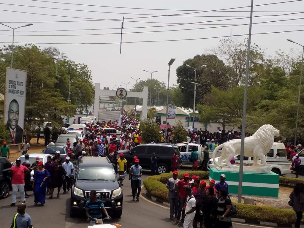 The jubilant workers, who were led by the leadership of the Organized Labour in the state, comprising the State Chairman of the Nigeria Labour Congress (NLC), Comrade Virginus Nwobodo, his Trade Union Congress (TUC) counterpart, Comrade Benneth Asogwa and Chairman of the Joint Public Service Negotiating Council, Comrade Igbokwe Chukwuma Igbokwe, among others, marched from the State Secretariat in GRA, through Garden Avenue, Ogui road and Bisala down to the Government House at Independence Layout. It was such an emotional event as the workers sang solidarity songs while also thanking Gov. Ugwuanyi for paying them the agreed new minimum wage, during the weekend.