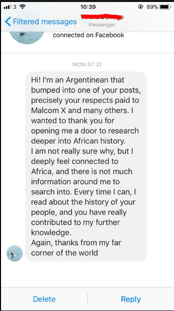 On the second screenshot, is a message from a fellow from faraway Argentina , I do not know, and chances are we may never meet in life nor will our paths cross. But she’s interested to know about this culture I’m talking, she’s curious, she’s inquisitive to know. That doesn’t make her non believer in Christianity.I don’t like putting my people down, because when and if I do so, I’m equally putting myself down, because I see myself in every Blackman, African, Nigerian and Igbo.