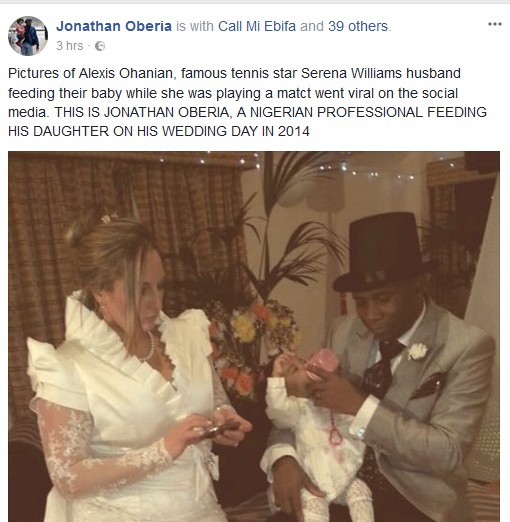 Pictures of Alexis Ohanian, famous tennis star Serena Williams husband feeding their baby while she was playing a match went viral on the social media. THIS IS JONATHAN OBERIA, A NIGERIAN PROFESSIONAL FEEDING HIS DAUGHTER ON HIS WEDDING DAY IN 2014..