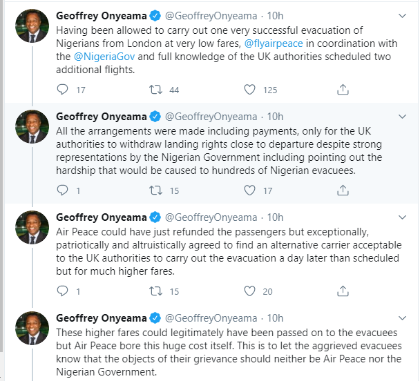 “Having been allowed to carry out one very successful evacuation of Nigerians from London at very low fares, @flyairpeace in coordination with the @NigeriaGov and full knowledge of the UK authorities scheduled two additional flights.