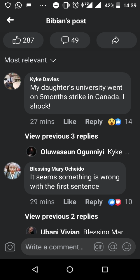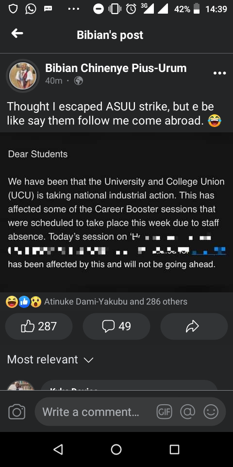 A Nigerian Bibian Chinenye Pius-Urum who recently relocated to you UK expresses shock as her institution embarks on industrial action. Although she was surprised she said ASUU and Nigeria has prepared her for every situation in life .
