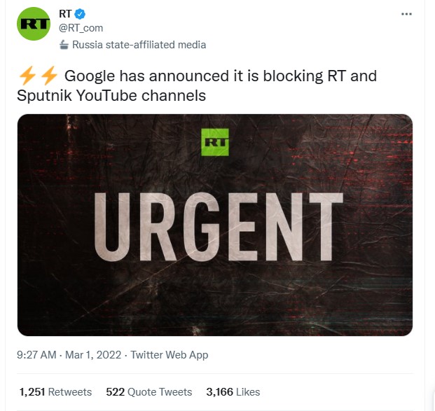 YouTube has blocked the channels of RT and Sputnik for all European users, the platform, owned by Google parent company Alphabet Inc., announced on Tuesday. The block came with immediate effect, the statement said, citing the “ongoing war in Ukraine.”