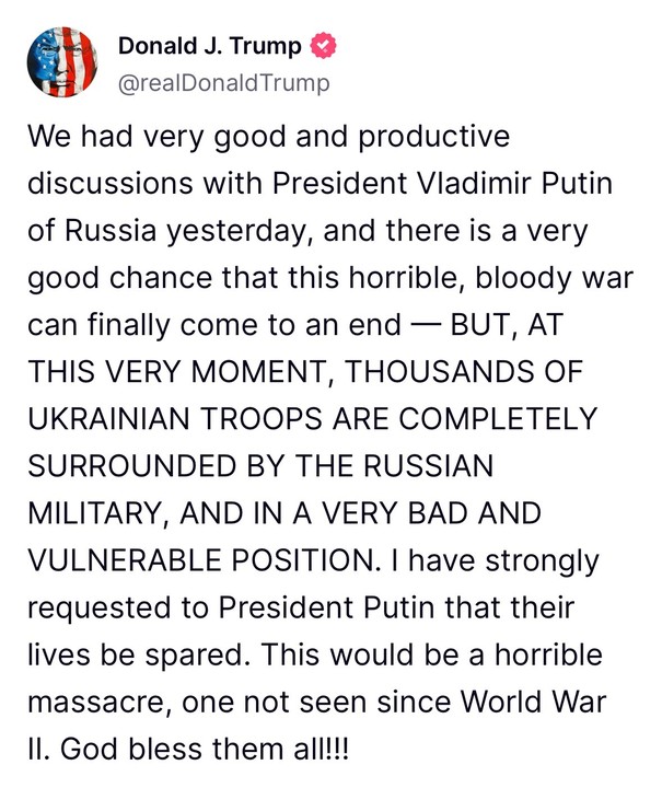 We had very good and productive discussions with President Vladimir Putin of Russia yesterday, and there is a very good chance that this horrible, bloody war can finally come to an end – BUT, AT THIS VERY MOMENT, THOUSANDS OF UKRAINIAN TROOPS ARE COMPLETELY SURROUNDED BY THE RUSSIAN MILITARY, AND IN A VERY BAD AND VULNERABLE POSITION. I have strongly requested to President Putin that their lives be spared. This would be a horrible massacre, one not seen since World War II. God bless them all!!!