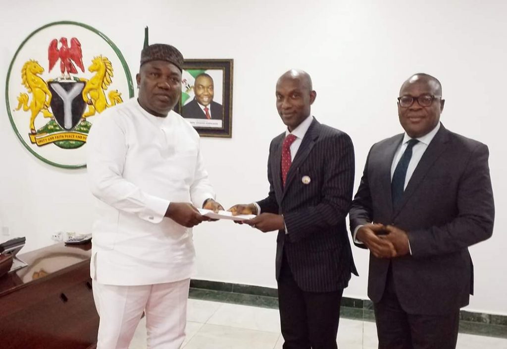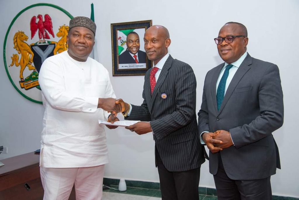 Pictures: Enugu State Governor, Rt. Hon. Ifeanyi Ugwuanyi (left) receiving from the Head, Department of African Geo-politics, Geo-law and International Diplomacy, United Nations International University for Peace, Europe Campus, Rome, Prof. Edmund Ugwu Agbo, the approval letter for establishment of the first African Campus of the University in Enugu State, at the Government House, Enugu, on Wednesday. With them on the right is the Secretary to the Enugu State Government, Prof. Simon Uchenna Ortuanya.