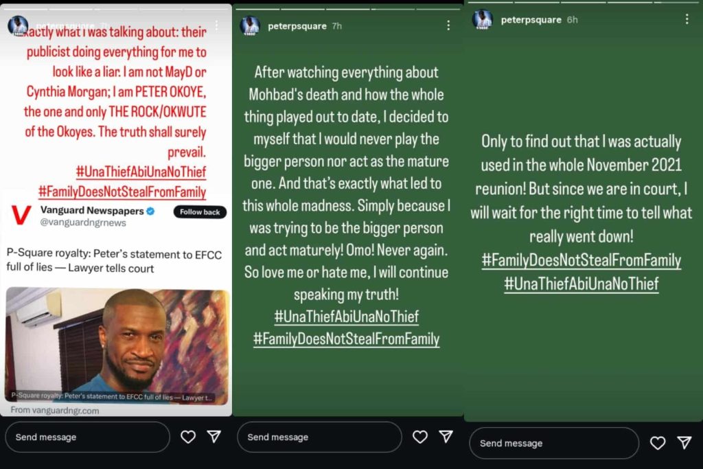 Peter took to his Instagram Story to react to a recent claim made by Jude Okoye’s lawyer in court. The lawyer had reportedly accused Peter of lying in a statement he submitted to the Economic and Financial Crimes Commission (EFCC) as part of their royalty-related case.