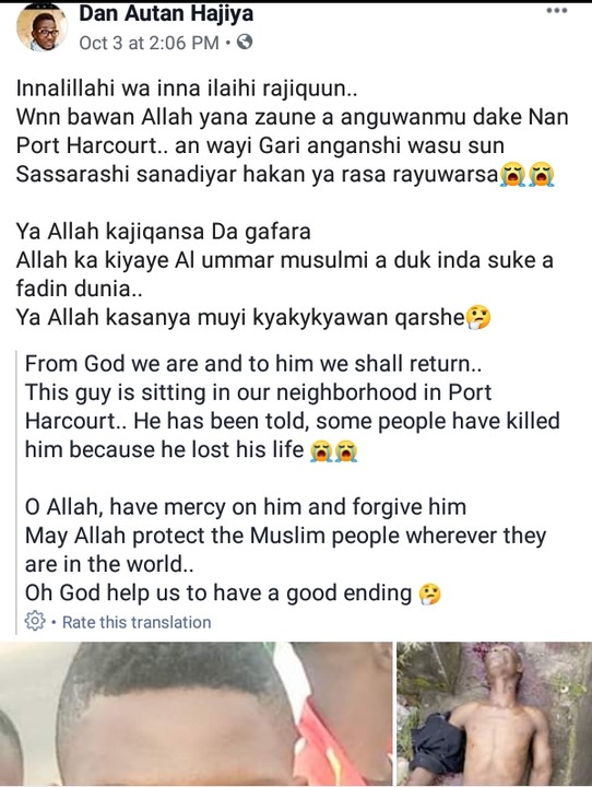 From the little I could understand from the story shared by Dan,the man pictured below was killed in Port Harcourt.It is unclear who killed him…