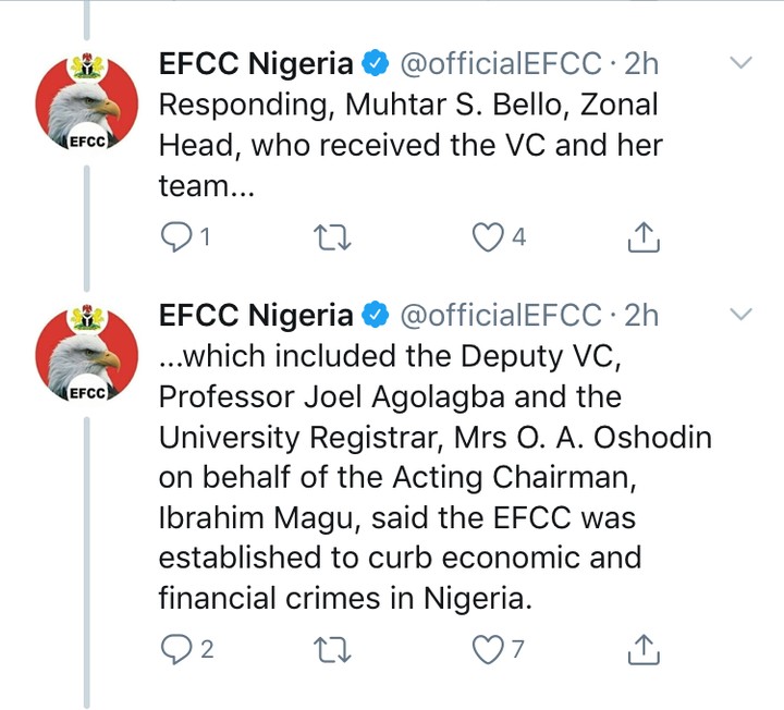 The official twitter handle of the anti graft agency made this known while revealing the purpose of her visit.
