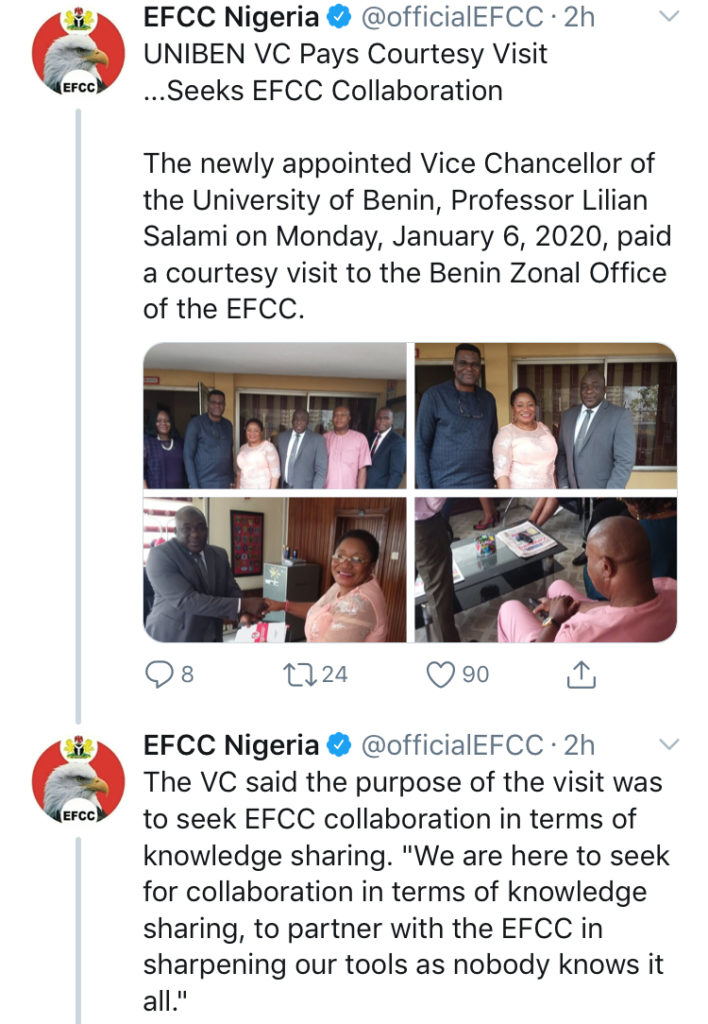 The newly appointed Vice Chancellor of the University of Benin, Professor Lilian Salami on Monday, January 6, 2020, paid a courtesy visit to the Benin Zonal Office of the EFCC.The VC said the purpose of the visit was to seek EFCC collaboration in terms of knowledge sharing. “We are here to seek for collaboration in terms of knowledge sharing, to partner with the EFCC in sharpening our tools as nobody knows it all.”