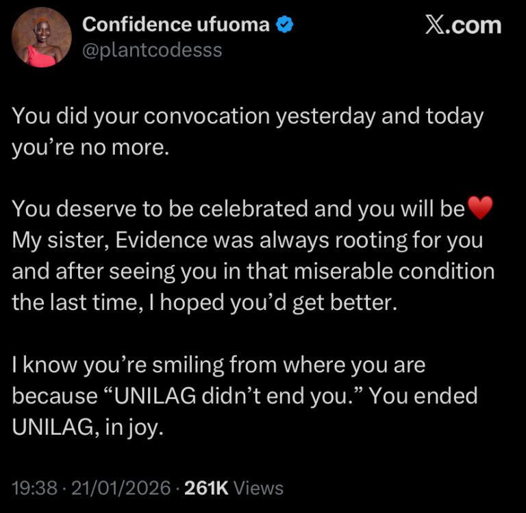 “You did your convocation yesterday and today you’re no more. You deserve to be celebrated and you will be. My sister, Evidence was always rooting for you and after seeing you in that miserable condition the last time, I hoped you’d get better. I know you’re smiling from where you are because ‘UNILAG didn’t end you.’ You ended UNILAG, in joy.”