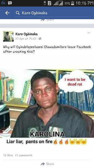 “Fellow Akokites, the reality is upon us. At about 6:40pm today the 11th of May, a fellow Akokite was arrested. His crime? He reposted a picture on his Facebook page of the deputy Dean 2 of the Students Affairs Division in person of Dr Karo Ogbinaka. Dr Karo made complaints to the Alpha base that he found the picture to be a threat to his life and therefore he should be arrested. Fellow Akokites, we are writing exams and our brother is at the moment in police custody for reposting a picture on his Facebook page. Our school authority are now demi gods that should be constantly revered. All attempts to bail Dolapo Olusesi has proven futile as the policemen claim they have been asked by the school management not to release him to serve as a lesson to others. A call put through to the DSA has proven futile as the DSA has asked that he be left there. Dolapo Olusesi is a 300 Law student. Dolapo needs to read for exams. Dolapo is at the moment in a cell. We call for the immediate release of a fellow learning colleague as this is an abysmal act on the part of the school authority. #FreeDolapo
