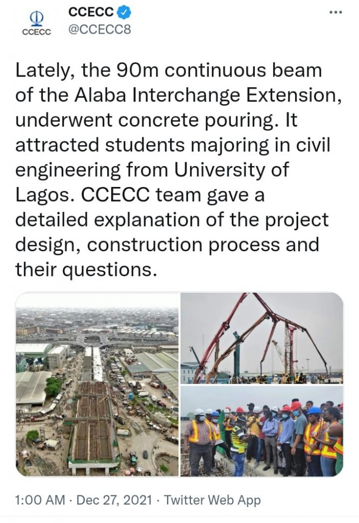 Lately, the 90m continuous beam of the Alaba Interchange Extension, underwent concrete pouring. It attracted students majoring in civil engineering from University of Lagos. CCECC team gave a detailed explanation of the project design, construction process and their questions.