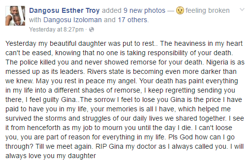 “Yesterday my beautiful daughter was put to rest.. The heaviness in my heart can’t be eased, knowing that no one is taking responsibility of your death. The police killed you and never showed remorse for your death. Nigeria is as messed up as its leaders. May you rest in peace my angel. Your death has paint everything in my life into a different shades of remorse, I keep regretting sending you there, I feel guilty Gina..The sorrow I feel to lose you Gina is the price I have paid to have you in my life, your memories is all I have, which helped me survived the storms and struggles of our daily lives we shared together. I see it from henceforth as my job to mourn you until the day I die. I can’t loose you, you are part of reason for everything in my life. Pls God how can I go through? Till we meet again. RIP Gina my doctor as I always called you. I will always love you my daughter”