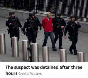 Video from the scene showed heavy police presence as the white male with grey hair, sporting a red sweater and olive jacket, was seen pacing back and forth in front of the government building.