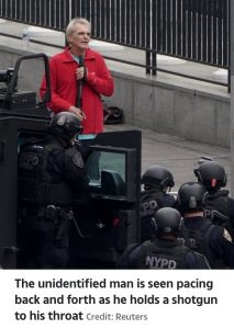 United Nations headquarters locked down as man holds shot gun to chin before surrendering after 3 hour police standoff.