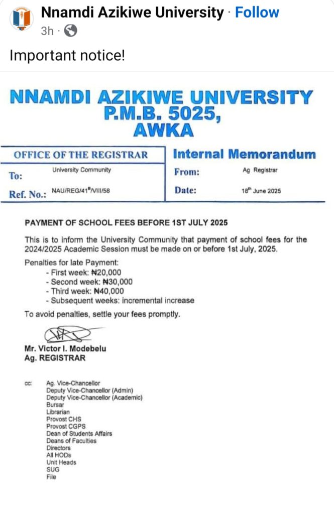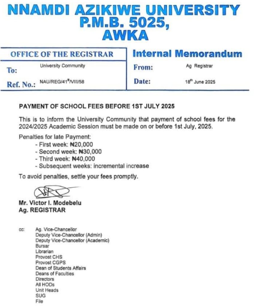 Nnamdi Azikiwe University (Unizik) management has announced that penalties will be imposed on students who fail to pay their tuition fees by July 1, 2025.