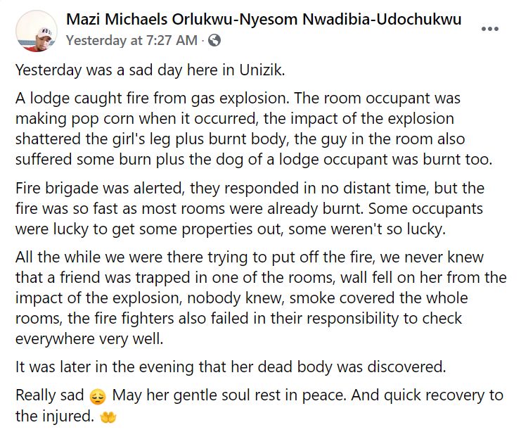 As At The Time Of Filing This NaijaCover Report, Some other occupants of the lodge, which is predominantly occupied by UNIZIK students sustained varying degrees of injury as a result of the inferno.